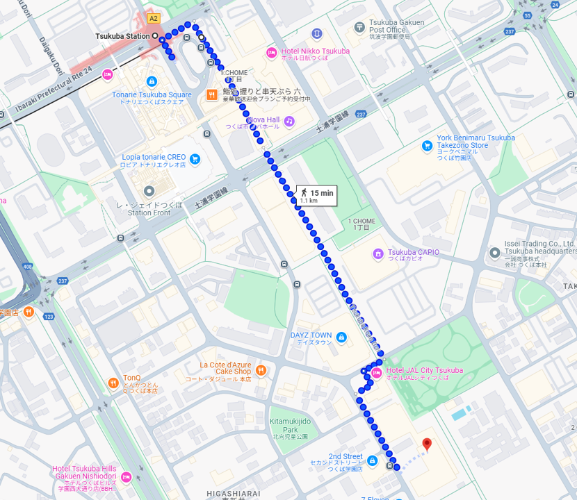 It takes about 15 minutes on foot from TX Tsukuba Station to Tsukuba International Congress Center. TX Tsukuba Station has exits A1 to A5, but please exit at A3 to get to ground level (map).