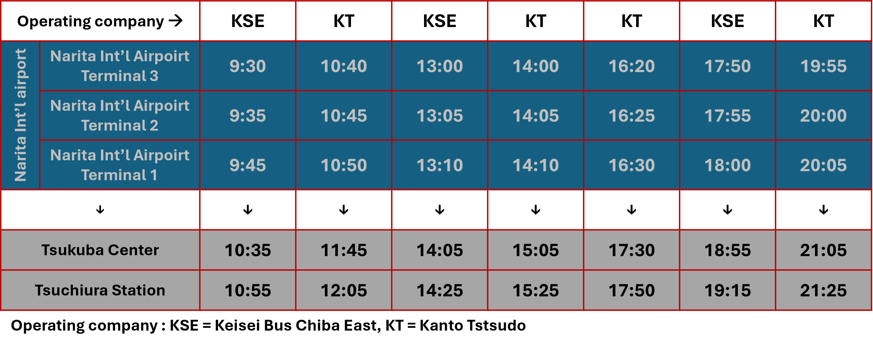 The bus timetable from Narita International Airport to Tsukuba Center is as shown in the table below.