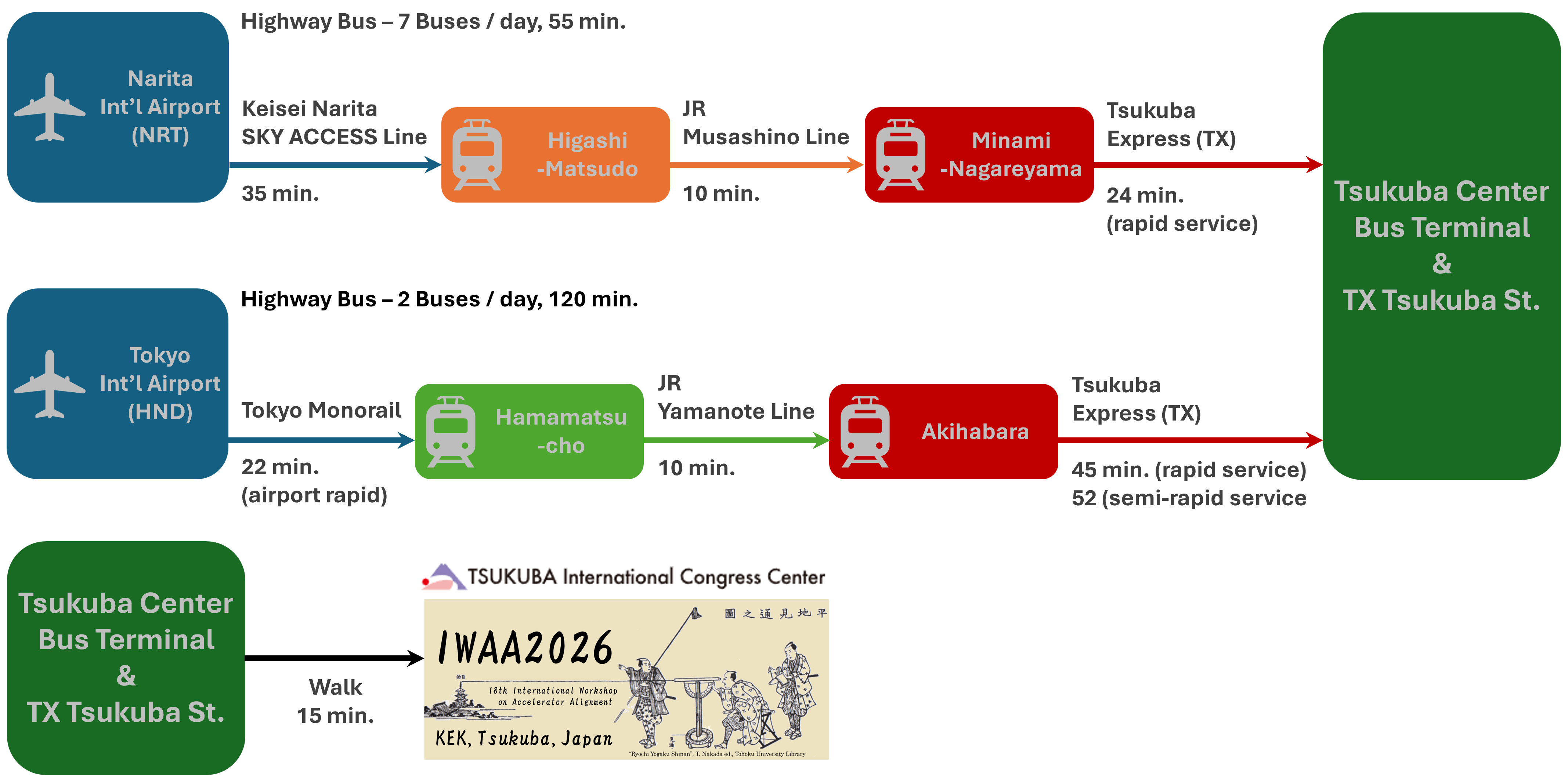 There are several international airports in Japan, but if you are coming directly to Tsukuba, we recommend choosing Narita International Airport or Tokyo International Airport (Haneda Airport) as your final arrival airport. The main means of transportation from each airport to Tsukuba International Congress Center are train and bus, and the connections and travel times are as shown in the diagram below.
